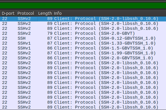 See the screenshot. It is all traffic from the OPENVAS SCAN. The authenticated tests are all sending the standard SSH-2.0- libssh_0.10.6 protocol version string.